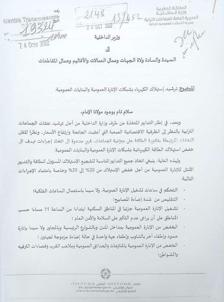 ”وتحث المذكرة على اتخاذ مجموعة من الخطوات لخفض استهلاك الكهرباء الآتية بعده، في إطار التدابير المتخذة من طرف وزارة الداخلية من أجل ترشيد نفقات الجماعات الترابية بالنظر إلى الظرفية الاقتصادية الصعبة التي أعقبت الجائحة وارتفاع الأسعار، ونظرا لثقل النفقات المرتبطة بفاتورة الطاقة على ميزانية الجماعات، حيث انها مدعوة الى اتخاذ إجراءات تهدف إلى خفض استهلاك الطاقة الكهربائية بشبكات الإدارات العمومية والبنايات العمومية، و ينبغي اتخاذ جميع التدابير المناسبة لتشجيع الإستهلاك المسؤول للطاقة والتدبير الأمثل للإنارة العمومية من أجل خفض الإستهلاك من 20% إلى 50% وخاصة باعتماد الإجراءات التالية: