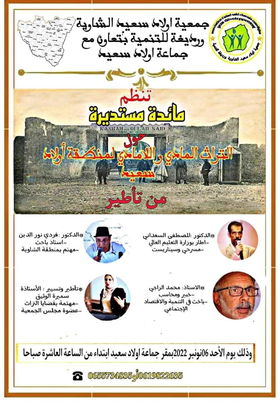 تخليدا للسنة الأولى من عمر الجمعية الذي يتزامن مع احتفال الشعب المغربي بذكرى المسيرة الخضراء، تنظم جمعية اولاد سعيد الشاوية ورديغة للتنمية ولأول مرة بالمنطقة، مائدة مستديرة حول موضوع ” التراث المادي و اللامادي لمنطقة اولاد سعيد”، وذلك يومه الأحد 6 نونبر 2022، بمركز جماعة اولاد سعيد انطلاقا من الساعة العاشرة صباحا.