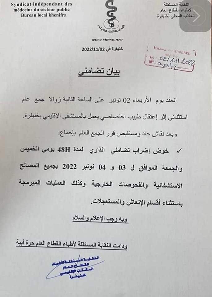 أصدرت النقابة المستقلة لأطباء القطاع العام المكتب الإقليمي بخنيفرة بعد اجتماعها اليوم بيانا تضامنيا من الطبيب المعتقل، على خلفية قضية الفساد و الابتزاز و الارتشاء التي هزت الرأي العام الوطني والمحلي، مقررة خوض إضراب عن العمل 48 ساعة ، يومي 3 و 4 نونبر الجاري في جميع المصالح، بإستثناء مصلحتي المستعجلات و الإنعاش ، و تأجيل كل العمليات البرمجة خلال هذين اليومين.