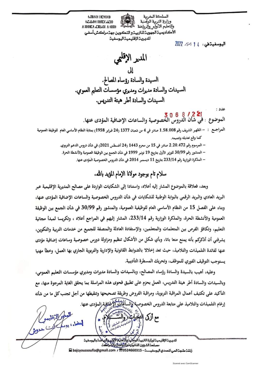 ظاهرة الدروس الخصوصية أصبحت واقعا مفروضا على الأسر ، مما أثر سلبا على جيوبهم ، وزاد في تكريس الأزمة المتفاقمة، ورغم إصدار مذكرة إقليمية من طرف المديرية الإقليمية بعد تقاطر الشكايات عليها من طرف الآباء والأمهات ، أصبح المسؤول الأول عن قطاع التربية والتعليم ملزما بتطبيق مقتضياتها ومضامينها لمحاربة الظاهرة