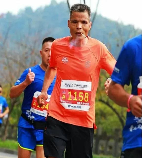 العداء المعروف باسم “العم تشين” 50 عامًا، أكمل مؤخرًا ماراثون شينغيانغ بمدينة جيانده الصينية، بينما كان يدخن السجائر طوال السباق الذي تبلغ مسافته 42 كيلومترًا.