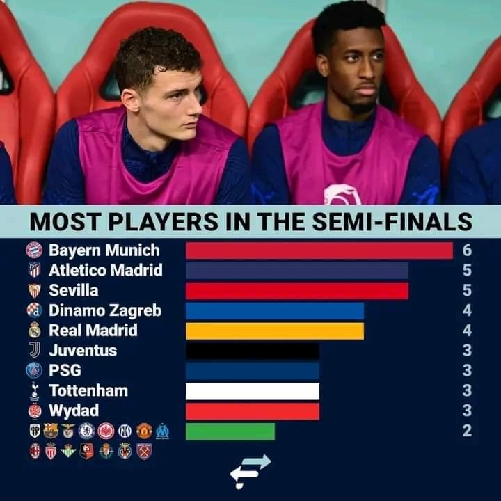 نشرت إحصائيات رسمية لحضور لاعبي الأندية العالمية بنصف نهاية كاس العالم بقطر حاليا، حيث يحضر الحارس التكناوتي والمدافع عطية الله ولاعب الوسط جبران ، وبالمناسبة فقد حضر لاعبو الوداد البيضاوي في مرحلة الربع ، وشاركوا في المقابلة التاريخية ضد البرتغال ، ولو اعتبرنا الحارس بونو والمدافع داري كلاعبين سابقين للوداد الأمة ، لكانت الوداد في الرتبة الثانية وراء فريق باير ميونيخ الألماني، و الذي يضم ستة لاعبين سيحضرون نصف نهائي كأس العالم بقطر . وهي رسالة مباشرة لمن يروج أن أغلب لاعبي المنتخب المغربي من أوربا ، بل هناك لاعبون مغاربة من أندية وطنية كالرجاء والفتح والوداد البيضاوي وأولمبيك أسفي وأولمبيك خريبكة قد أنتجت هؤلاء المحترفين الذين غادروا الوطن من أجل تطوير مستواهم الكروي والمادي، ولكن يبقى المغرب هو المنتج لهؤلاء المبدعين الذين حققوا بالامس ملحمة كروية غير مسبوقة في سجل كرة القدم الوطنية.