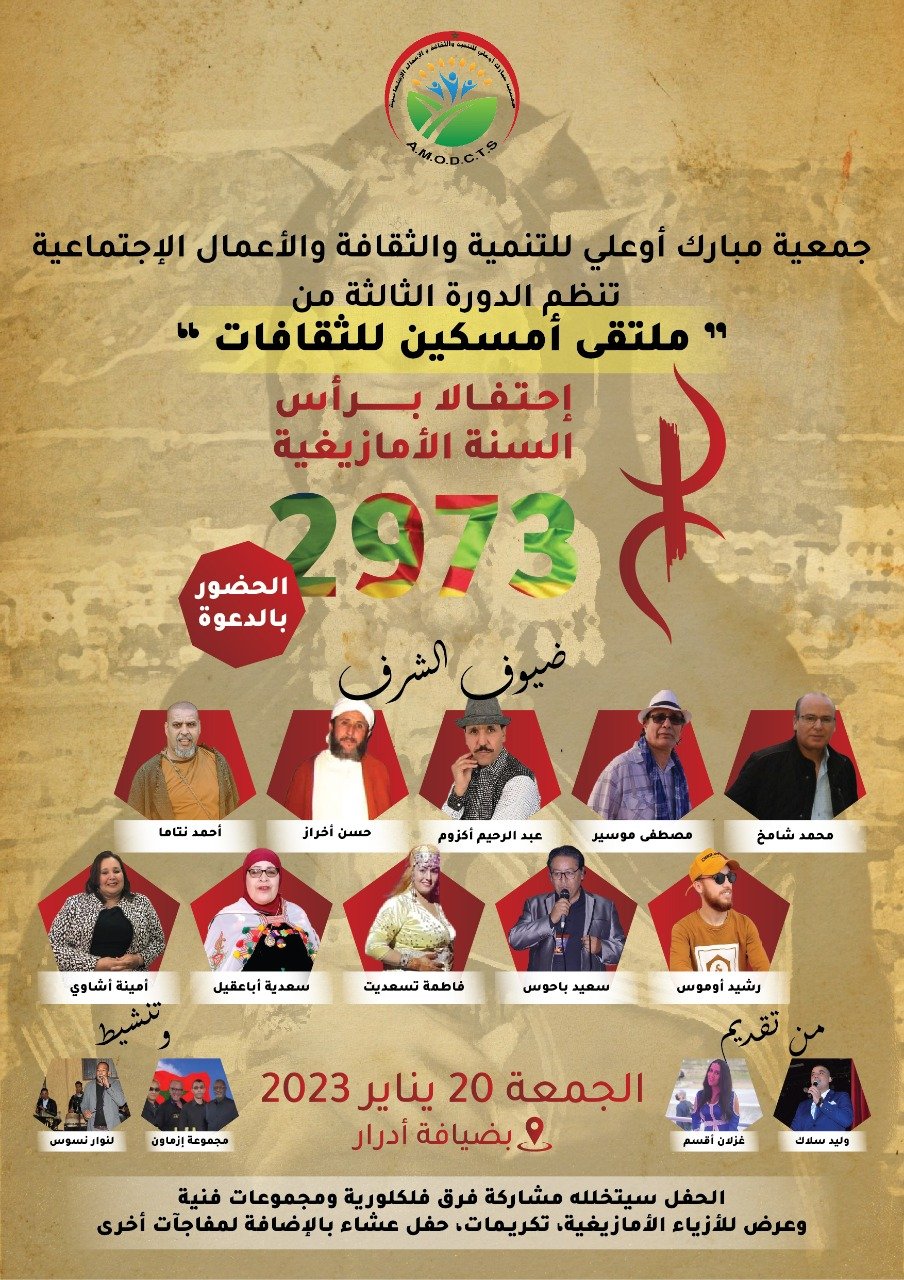 بمناسبة حلول السنة الأمازيغية الجديدة، تنظم جمعية مبارك أوعلي للتنمية والثقافة والاعمال الإجتماعية، الدورة الثالثة من ملتقى أمسكين للثقافات” و ذلك يوم الجمعة 20 يناير الجاري، ابتداءً من الساعة السادسة مساء بدار الضيافة ادرار بدوار أكلكال منطقة أمسكين جماعة الدراركة .