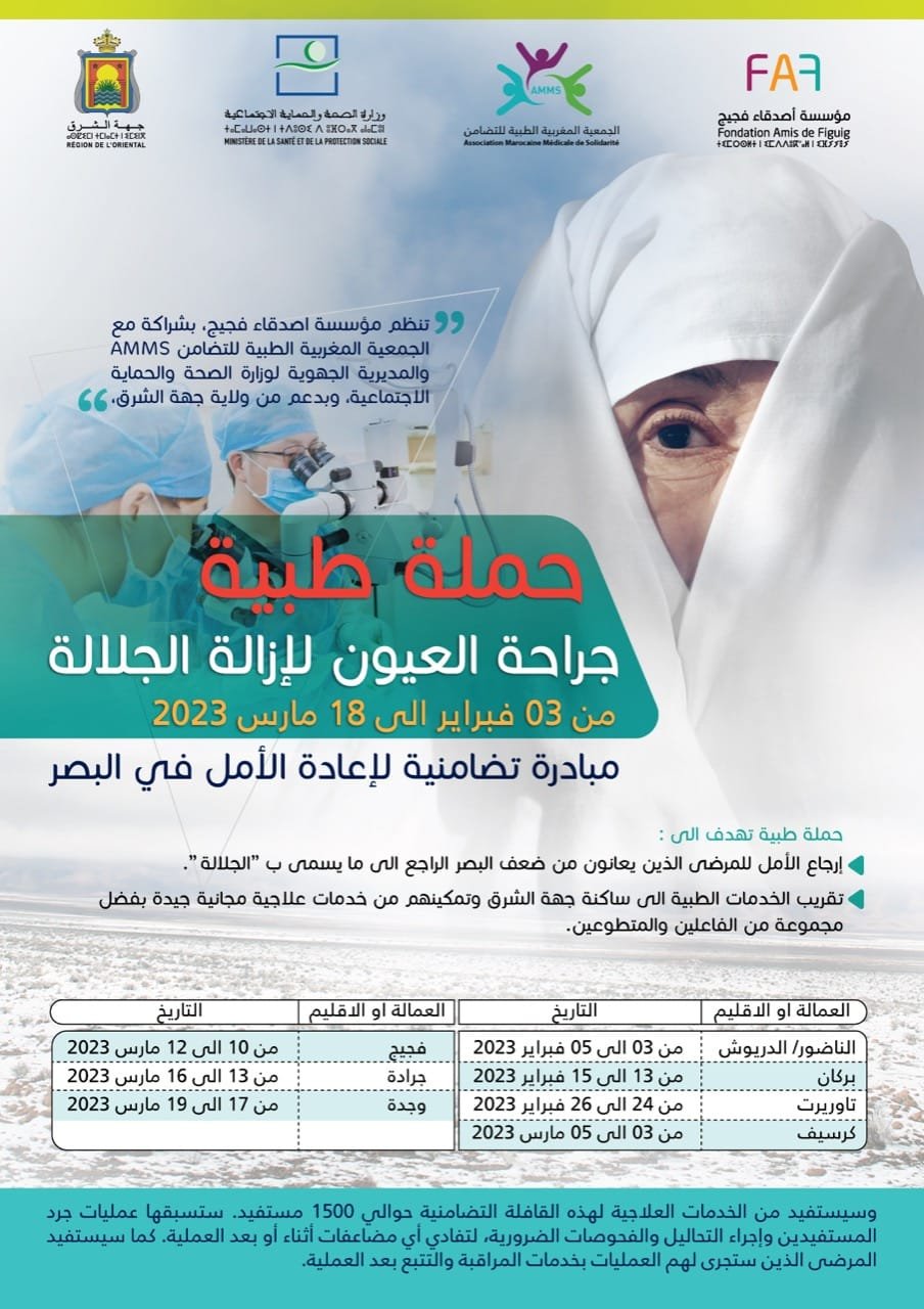 تنظم جمعية مؤسسة أصدقاء فكيك بشراكة مع الجمعية المغربية الطبية للتضامن و الحماية الإجتماعية (AMMS), و بدعم من ولاية الشرق، حملة لجراحة العيون لإزالة الجلالة و ذلك من يوم 03 فبراير إلى 18 مارس 2023.