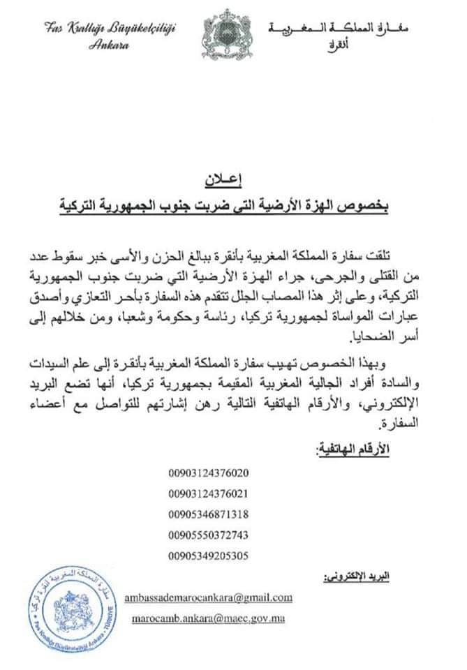 سفارة المغرب في تركيا توجه رسالة للمغاربة بعد الزلزال العنيف، و تتقدم بأحر التعازي و المواساة إلى الشعب التركي رئاسة و حكومة و شعبا.