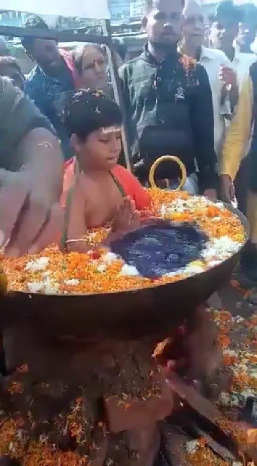 طفل هندي يجلس في إناء يحتوي على ماء مغلي يثير جدلا في اوساط التواصل الاجتماعي حيث يحيط به ماء مغلى وبعض من الخضروات حسب المقطع، والنار أسفله دون أن يشعر أي شيء، وهو الأمر الذي أصاب رواد المشاهدين بالصدمة.