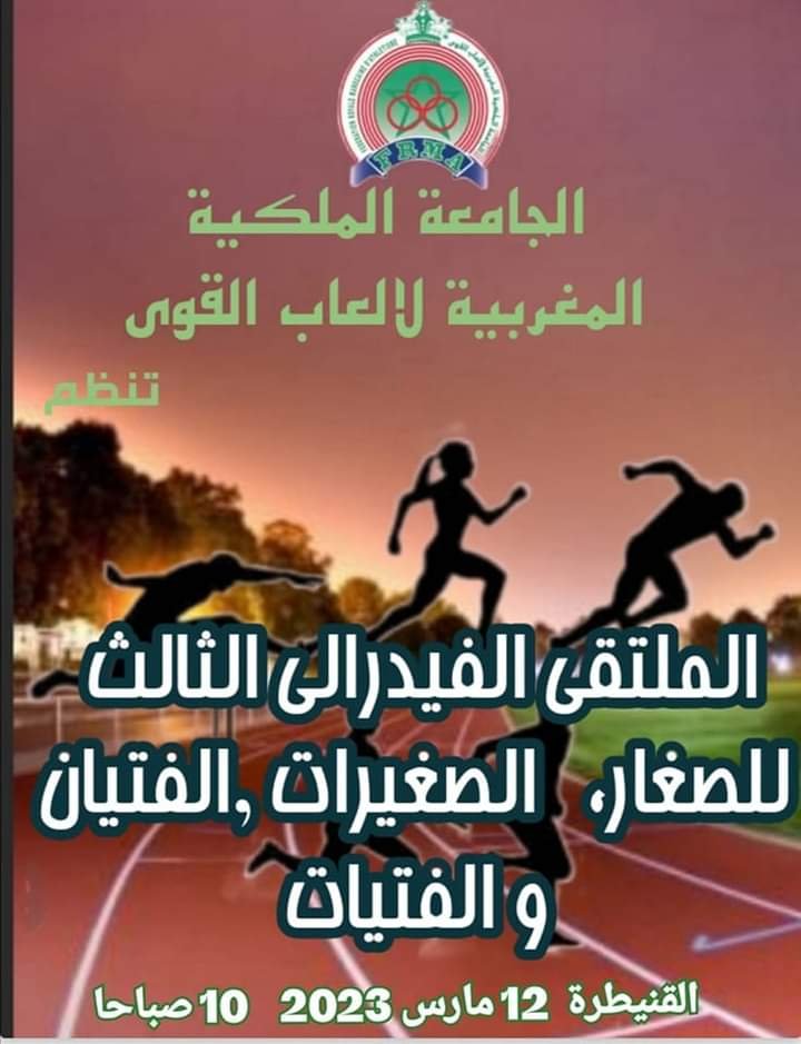 تنظم الجامعة الملكية المغربية لألعاب القوى بتنسيق مع عصبة الغرب الشراردة بني حسين لألعاب القوى، الملتقى الفدرالي الثالث لألعاب القوى للفئات العمرية التالية :(صغيرات، صغار، فتيات، فتيان) يوم الأحد 12 مارس 2023 بحلبة ألعاب القوى بمدينة القنيطرة.