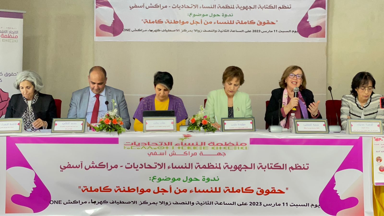 نظمت الكتابة الجهوية لمنظمة النساء الاتحاديات مراكش اسفي مساء يوم السبت 11 مارس 2023 بنادي الاصطياف كهرماء بمراكش ندوة تحت عنوان حقوق كاملة للنساء من اجل مواطنة كاملة بمشاركة كل من الكاتبة الوطنية لمنظمة النساء الاتحاديات حنان رحاب، ووزيرة التضامن والأ سرة في حكومة التناوب نزهة الصقلي، والدكتور محمد الغالي عميد كلية الحقوق بقلعة السراغنة، وزهرة الصادق عضو فيدرالية رابطة حقوق النساء مراكش اسفي ،والاستاذة الباحثة بجامعة القاضي عياض فاطمة الزهراء افلاحن