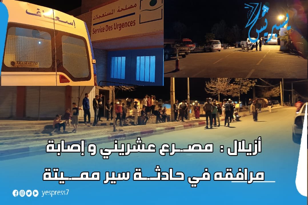 في هذا السياق، كشفت مصادر مطلعة لموقع “يسبريس7 الإلكتروني”، ان الحادث المذكور قد أسفر عن وفاة السائق في عين المكان، فيما اصيب مرافقه بجروح خطيرة، عجلت بنقله في حالة حرجة إلى المستشفى الجهوي لبني ملال، فيما أصيبت سيدة كانت تمر بمكان الحادث بجروح خفيفة غادرت بعدها قسم المستعجلات بعد تلقيها للعلاجات الضرورية.