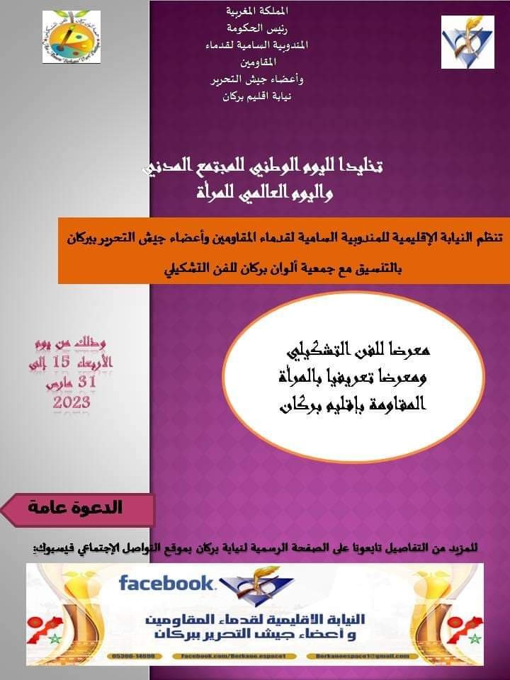 تخليدا لليوم الوطني للمجتمع المدني واليوم العالمي للمرأة ستشارك جمعية ألوان بركان للفن التشكيلي في المعرض الذي ستنظمه النيابة الإقليمية للمندوبية السامية لقدماء المقاومين واعضاء جيش التحرير ببركان وذلك من 15ال 31ملرس 2023.