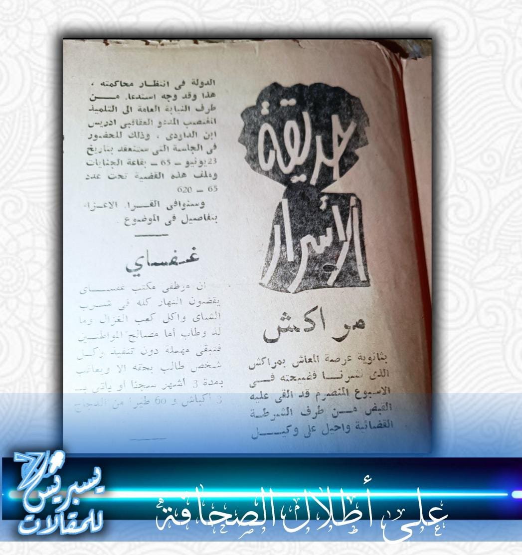 ففي عددها 26 الصادر يوم 25 يونيو 1965 ،نشر خبر اغتصاب تلميد بإحدى ثانويات مدينة مراكش (ثانوية عرصة المعاش) ،وتم اعتقال الجاني واحالته على النيابة العامة…