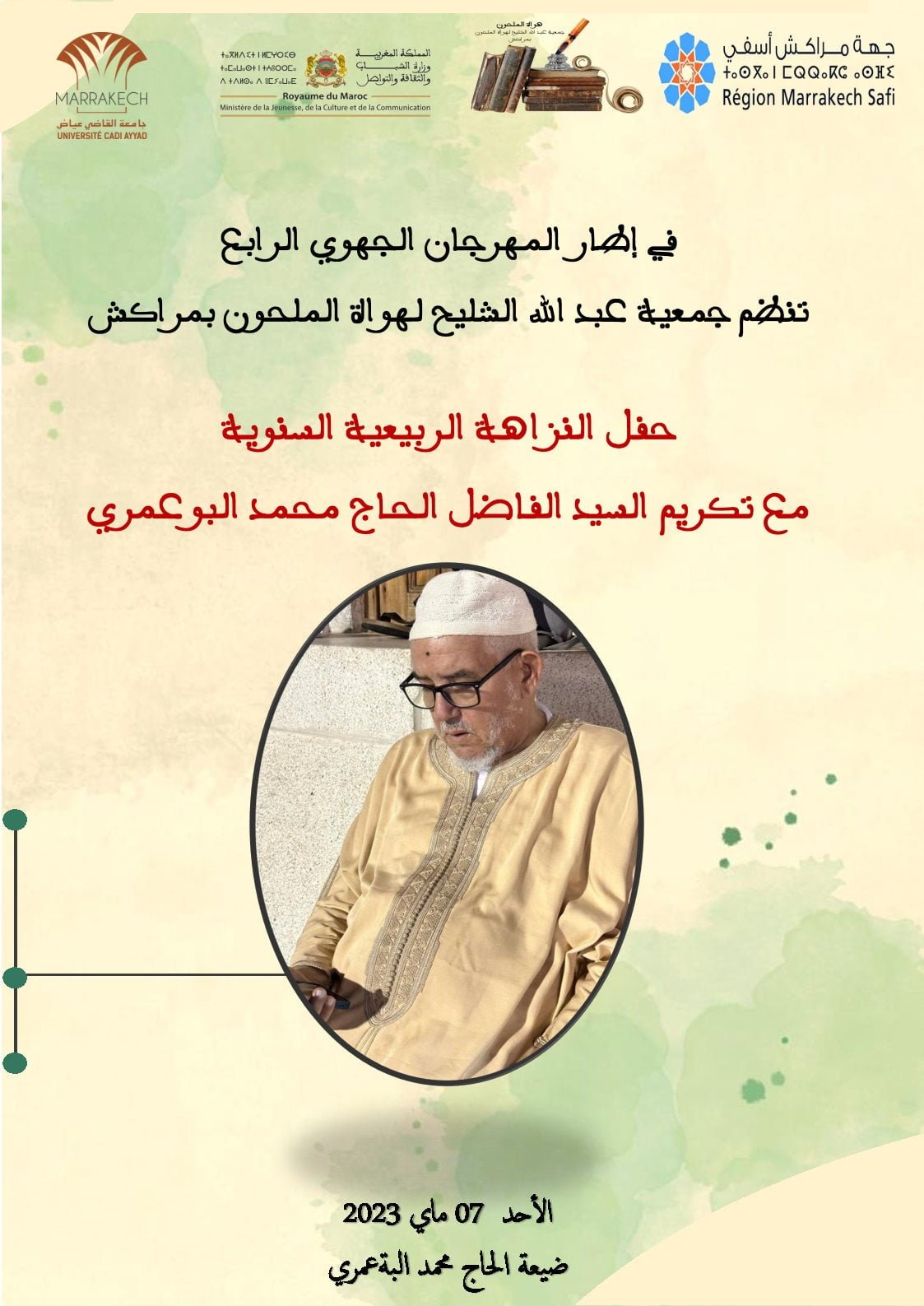 بدعم من جهة مراكش اسفي، وزارة الشباب والثقافة والتواصل ، جامعة القاضي عياض تنظم جمعية عبد الله الشليح لهواة الملحون بمراكش يوم الاحد 7 ماي 2023 حفل النزاهة الربيعية الذي يندرج في اطار المهرجان الجهوي الرابع للملحون،وكما جرت العادة سيشهد الحفل الاحتفاء باحدى الفعاليات المراكشية الحاج محمد البوعمري