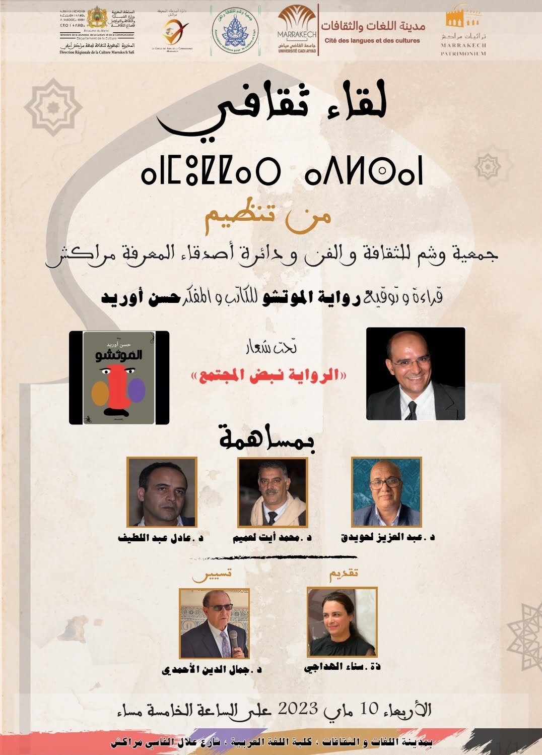 بمشاركة دكاترة و اساتذة باحثين في الاداب العربي تنظم جمعية وشم للثقافة والفن ودائرة اصدقاء المعرفة بمراكش لقاء ثقافيا تحت عنوان الرواية نبض المجتمع، سيتم خلاله قراءة وتوقيع رواية الموتشو للكاتب والمفكر حسن اوريد وذلك يوم الاربعاء 10 ماي 2023 على الساعة الخامسة مساء بمدينة اللغات والثقافات كلية اللغة العربية مراكش