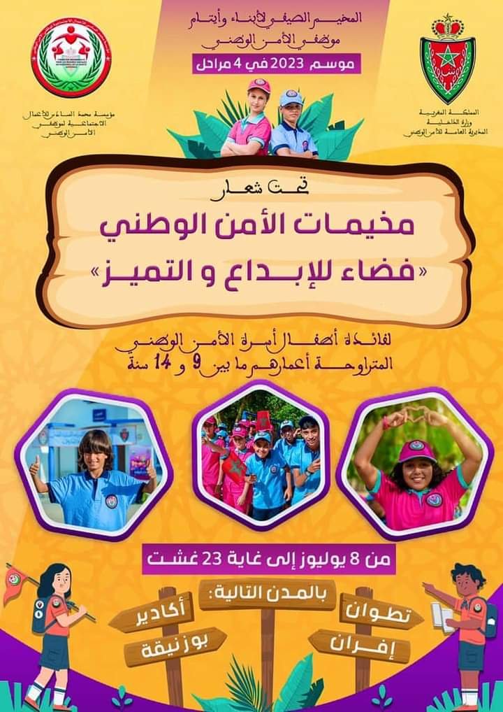 أطلقت مؤسسة محمد السادس للأعمال الاجتماعية لموظفي الأمن الوطني، خلال الأسبوع الجاري، عملية التسجيل الأولي من أجل استفادة أطفال وأيتام موظفي الأمن الوطني من فعاليات المخيمات الصيفية لسنة 2023، والتي سيتم تنظيمها خلال الفترة الممتدة ما بين 08 يوليوز و23 غشت 2023، بمجموعة من مراكز الاصطياف التي تم تجهيزها بمدن أكادير وبوزنيقة وتطوان وإفران .