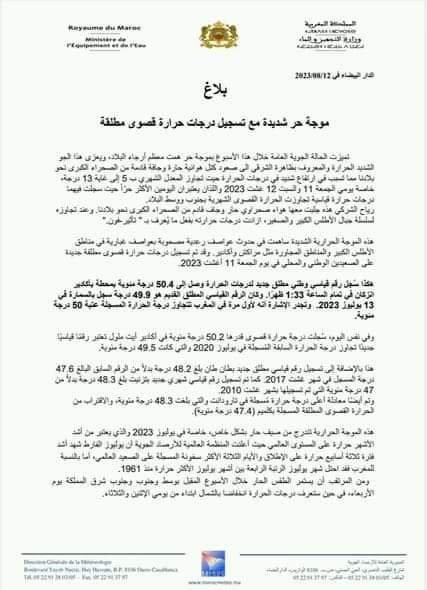 أفادت المديرية العامة للأرصاد الجوية، اليوم السبت، بأن الحالة الجوية العامة خلال الأسبوع الجاري، تميزت بموجة حر شديدة همت معظم أرجاء المملكة مع تسجيل درجات حرارة قصوى مطلقة.