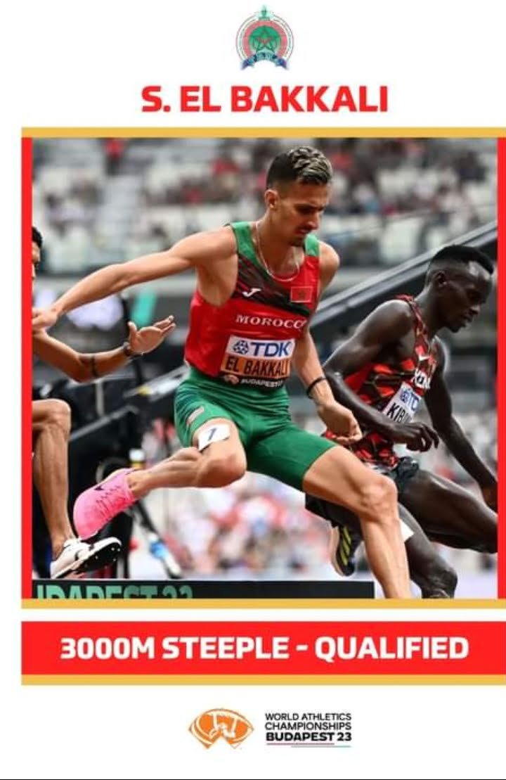 شهد اليوم الأول من المشاركة المغربية في بطولة العالم لألعاب القوى المقامة بالعاصمة المجرية بودابست تأهل البطل الأولمبي والعالمي المغربي سفيان البقالي، اليوم السبت، لنهائي سباق 3000 متر موانع، وحل هذا الأخير في المركز الثاني ضمن السلسلة الثانية حيث حقق توقيت 8 دقائق و 23 ثانية و 66 جزءا من المائة، وللأسف أقصي العداء صلاح الدين بن يزيد بعدما حل في المركز العاشر ضمن نفس السلسلة بتوقيت 8 دقائق و 38 ثانية و14 جزءا من المائة.