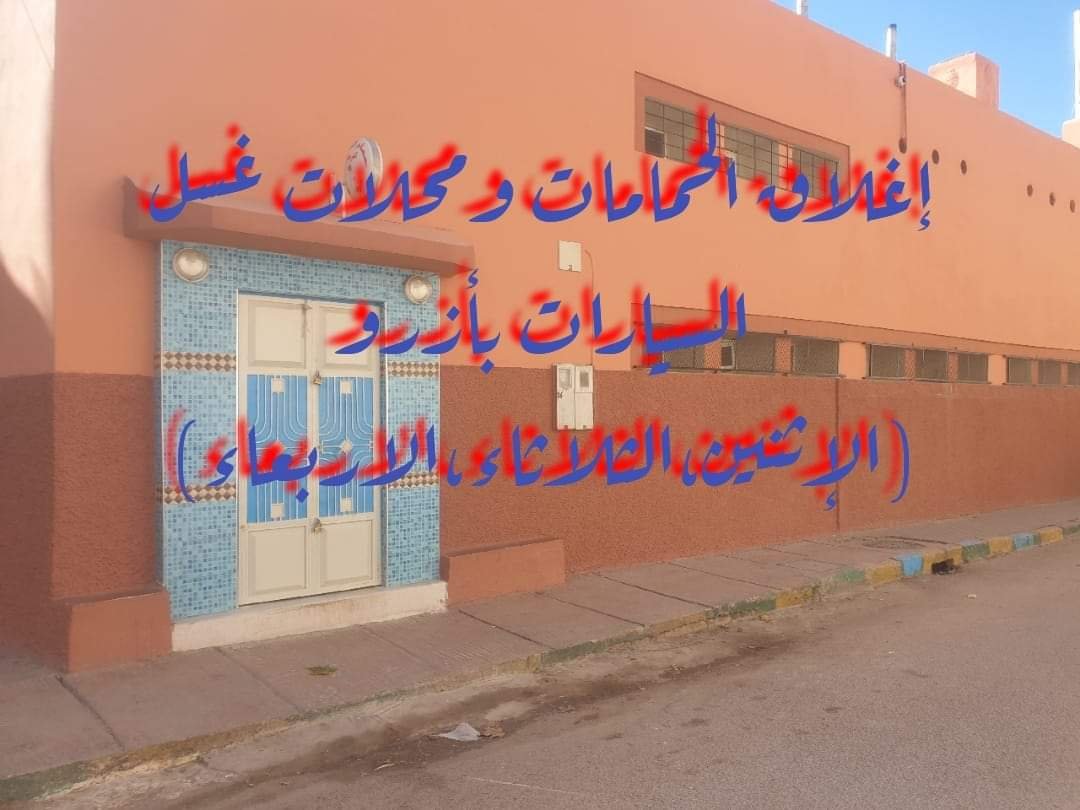 تنفيذاً للقرار العاملي وفي إجراءات جديدة لمواجهة الاجهاد المائي ونذرة المياه الصالحة للشرب، قررت السلطات المحلية بمدينة أزرو إغلاق الحمامات الشعبية والعصرية، ومحلات غسل السيارات لمدة 3 أيام في الأسبوع (الاثنين، الثلاثاء، الأربعاء)، وتم تحديد أيام العمل في الخميس، والجمعة، والسبت والأحد من كل أسبوع.