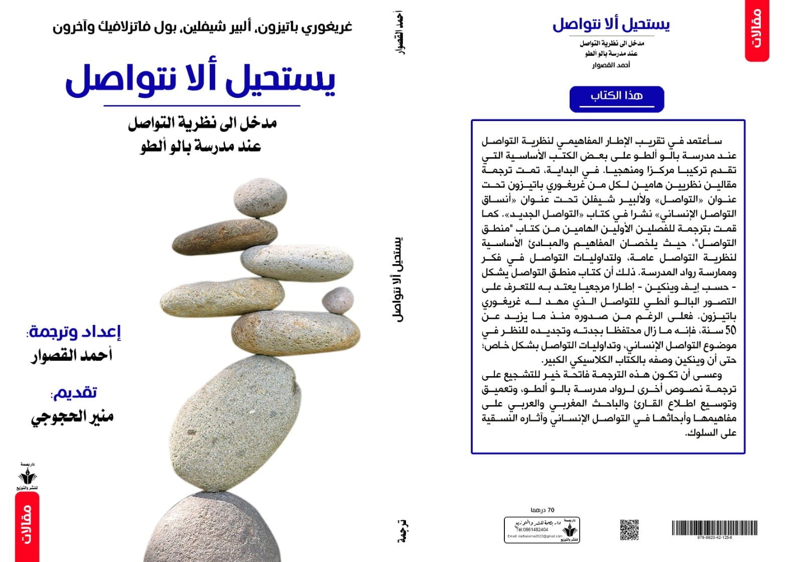 صدر نهاية يناير 2024 كتاب – ترجمة للباحث والمترجم احمد القصوار تحت عنوان “يستحيل الا نتواصل: مدخل الى نظرية التواصل عند مدرسة بالوالطو” ( اعداد وترجمة) عن دار بصمة للنشر والتوزيع. ويتضمن الكتاب نصوصا / مقالات أساسية وتاسيسية لرواد مدرسة بالوالطو؛ وخاصة غريغوري باتيزون والبير شيفلين وبول فاتزلافيك.