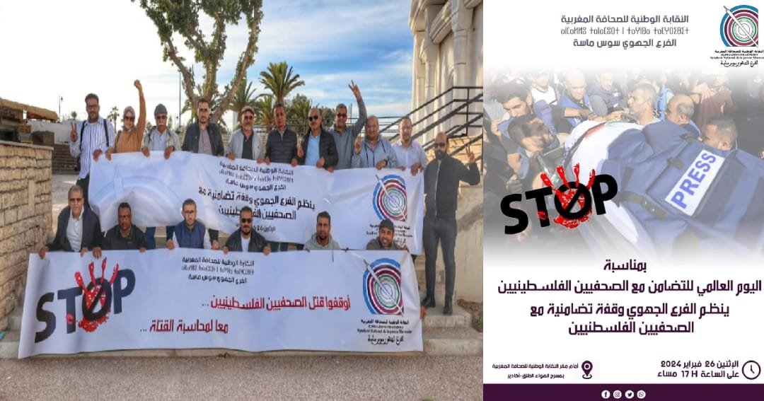 بمناسبة اليوم العالمي للتضامن مع الصحفيين الفلسطينيين والذي يصادف 26 من فبراير كما اعتمده الإتحاد الدولي للصحفيين يوما جديدا، نظم الفرع الجهوي للنقابة الوطنية للصحافة المغربية بجهة سوس ماسة، يوم أمس الإثنين 26 فبراير الجاري، وقفة تضامنية مع الصحفيين الفلسطينيين ومع ضحايا العدوان الإسرائيلي بفلسطين المحتلة وبقطاع غزة خاصة .