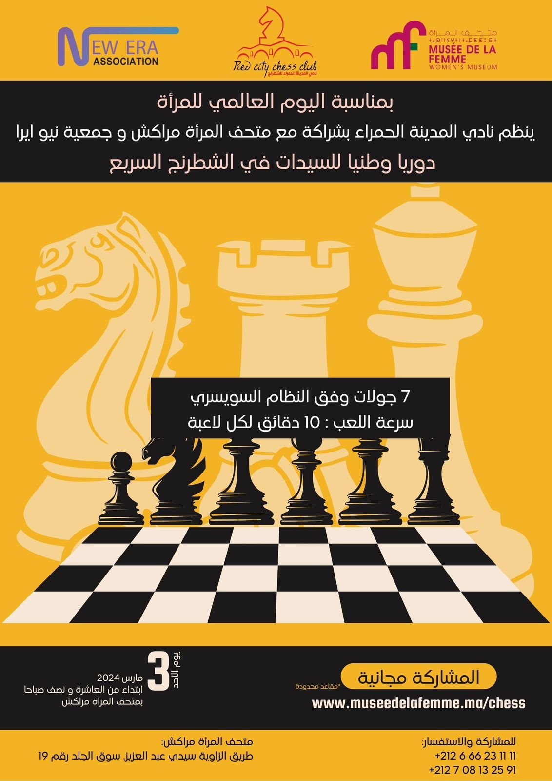 تعلن جمعية نيو ايرا مع نادي المدينة الحمراء للشطرنج وبشراكة مع متحف المرأة عن إطلاق دوري نسوي للشطرنج السريع ، بمناسبة اليوم العالمي للمرأة تحت شعار “مع كل نقلةنحتفل بقوة المراة في يومها الخاص”يومه الاحد 03مارس 2024 على الساعة العاشرة صباحا. بهدف تعزيز مشاركة النساء في هذه اللعبة الفكرية المثيرة.