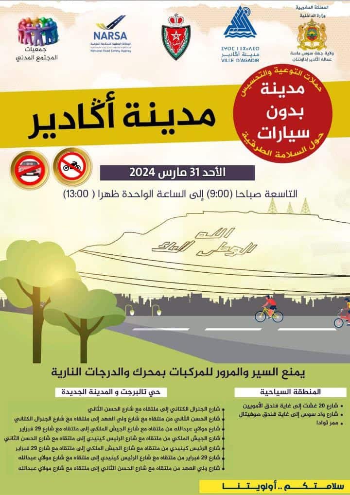 ينخرط مجلس مدينة أكادير في مقاربة تشاركية مع ولاية الجهة والأمن الوطني والوكالة الوطنية السلامة الطرقية وجمعيات المجتمع المدني بمدينة أكادير في حملة تحسيسية لفائدة الساكنة حول السلامة الطرقية يوم الأحد 31 مارس 2024، وذلك من الساعة التاسعة صباحا الى الساعة الواحدة ظهرا، تحت شعار “مدينة أكادير بدون سيارات”.