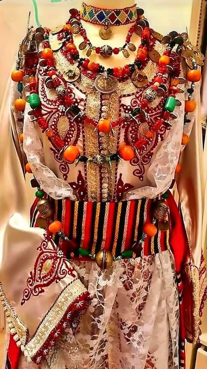 ولا تكتمل الإطلالة إلا بإضافة الحلي الأمازيغي، الذي يتكون من عقود وأقراط من الفضة، مزينة بألوان زاهية.