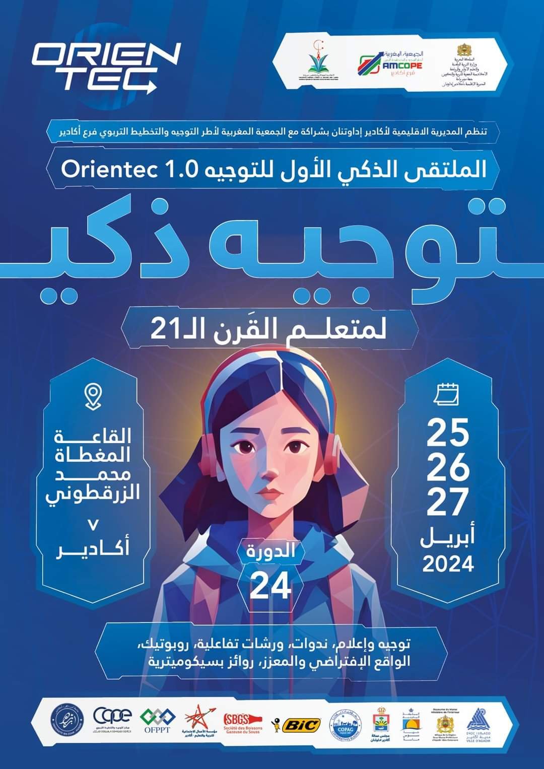 تماشيا مع سياق الانخراط في منظومة التحول الرقمي باعتباره ورشا مهما يحظى بالأولوية في بلادنا و تنفيذا لالتزامات خارطة الطريق 2022-2026، لاسيما الالتزام الرابع المتعلق بتوجيه التلميذات والتلاميذ نحو مسارات دراسية ملائمة لمؤهلاتهم وميولاتهم للرفع من فرص نجاحهم، تنظم المديرية الإقليمية لوزارة التربية الوطنية والتعليم الأولي والرياضة بأكادير إداوتنان وبشراكة مع الفرع الإقليمي للجمعية المغربية لأطر التوجيه والتخطيط التربوي، الملتقى الإقليمي للتوجيه في نسخته الرابعة والعشرين، تحت شعار: “توجيه ذكي لمتعلم القرن 21″، وذلك خلال الأيام 25 – 26 – 27 أبريل 2024 بالقاعة المغطاة بثانوية محمد الزرقطوني التأهيلية بأكادير.