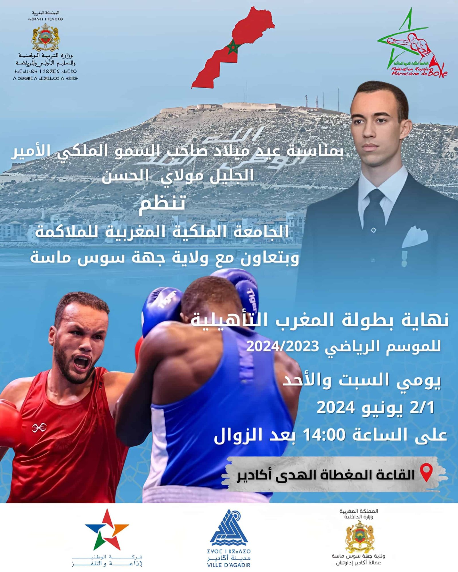 بمناسبة عيد ميلاد صاحب السمو الملكي ولي العهد الأمير الجليل مولاي الحسن تنظم الجامعة الملكية المغربية للملاكمة وبتعاون مع ولاية جهة سوس ماسة عمالة أكادير إداوتنان و مجلس جماعة مدينة أكادير نصف نهاية ونهاية بطولة المغرب التأهيلية للملاكمة كبار برسم الموسم الرياضي 2023/2024 وذلك يومي السبت 01 والأحد 02 يونيو 2024 بالقاعة المغطاة بحي الهدى بمدينة أكادير