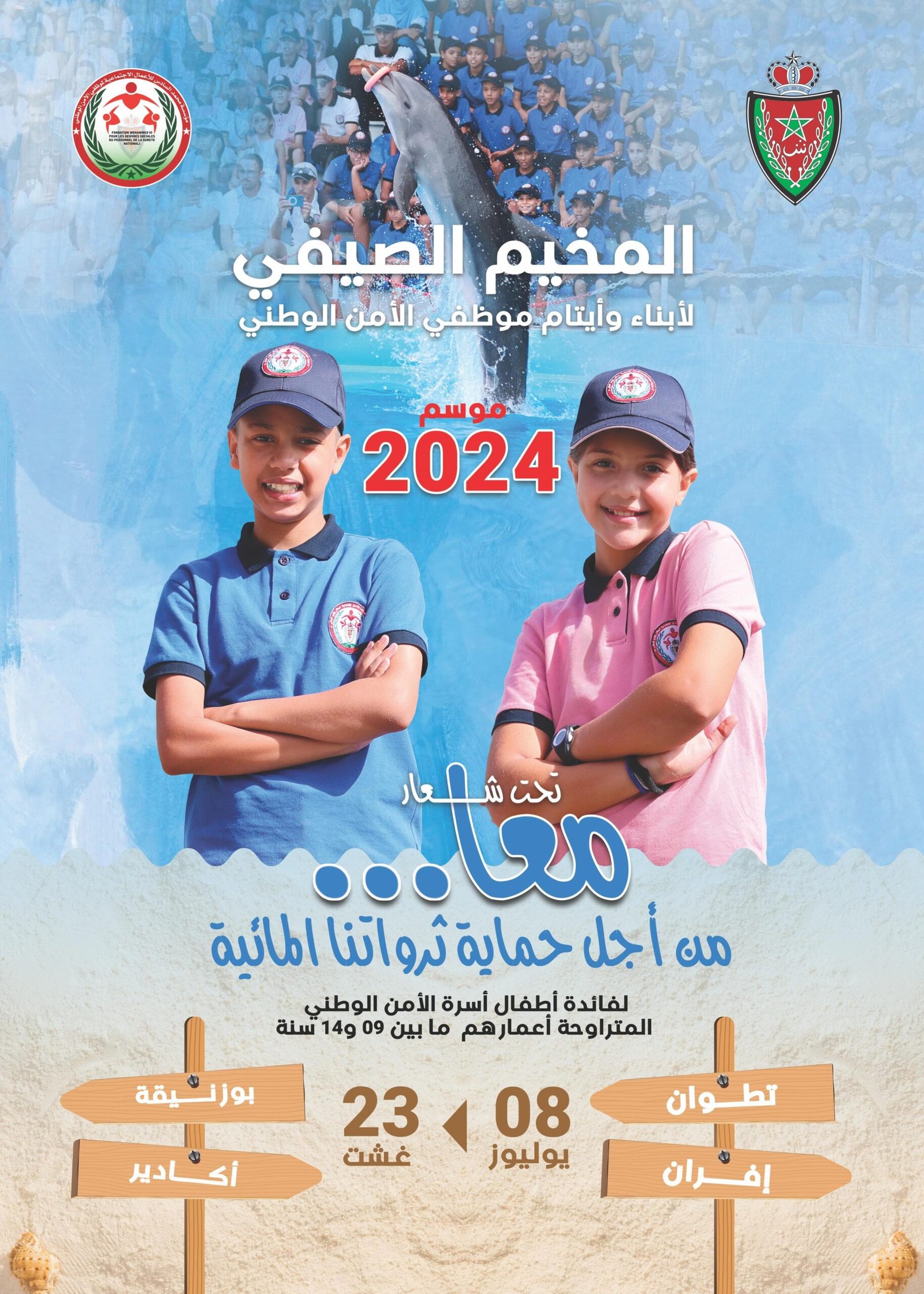 وسيتم تنظيم النسخة السنوية الحالية من المخيمات الصيفية لفائدة أبناء أسرة الأمن الوطني تحت شعار: “معا… من أجل حماية ثرواتنا المائية”، وهو الشعار الذي يهدف إلى ترسيخ ثقافة الحفاظ على البيئة والمحافظة على المقدرات والمصادر المائية، وذلك من خلال تلقين المشاركات والمشاركين رسائل تعليمية وسلوكيات إيجابية للاستهلاك الرشيد للماء وتشجيعهم على الاستمتاع بالطبيعة دون الإضرار بها .