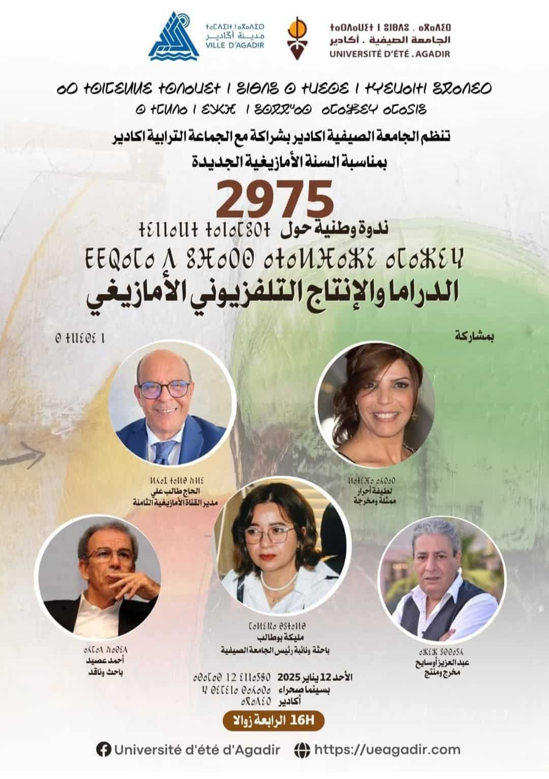 تنظم الجامعة الصيفية اكادير، بشراكة مع الجماعة الترابية اكادير، بمناسبة السنة الأمازيغية الجديدة 2975، ندوة وطنية حول “الدراما والانتاج التلفزي الأمازيغي”، وذلك يوم الأحد 12 يناير 2025 بقاعة سينما صحراء باكادير، على الساعة 4 زوالا.