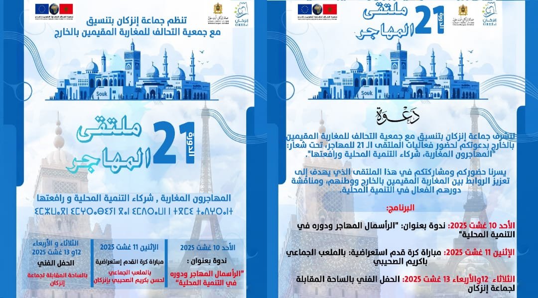 تعيش مدينة إنزكان، خلال الفترة الممتدة من 10 إلى 13 غشت 2025، على إيقاع فعاليات الملتقى الـ 21 للمهاجر، الذي تنظمه جماعة إنزكان بتنسيق مع جمعية التحالف للمغاربة المقيمين بالخارج، تحت شعار: “المهاجرون المغاربة، شركاء التنمية المحلية ورافعتها” .
