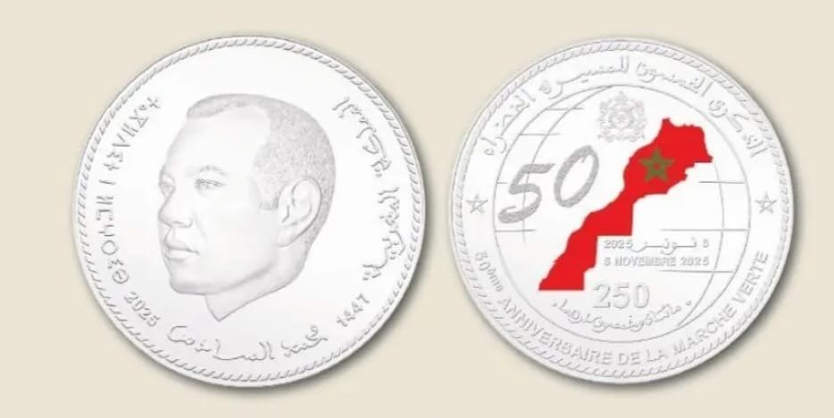 أصدر بنك المغرب قطعة نقدية تذكارية فضية من فئة 250 درهما، وذلك تخليدا للذكرى الخمسين للمسيرة الخضراء المظفرة.