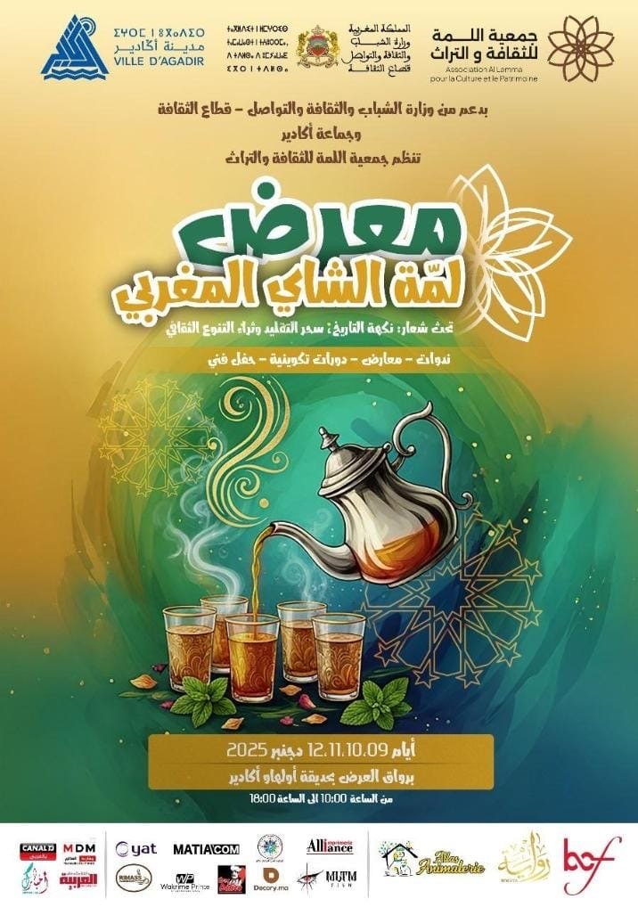 تحتضن مدينة أكادير، من 9 إلى 12 دجنبر 2025، النسخة الأولى من معرض “لمة الشاي المغربي”، الذي تنظمه جمعية اللمة للثقافة والتراث بشراكة مع وزارة الشباب والثقافة والتواصل وجماعة أكادير، وذلك برواق العرض بحديقة أولهاو، في مبادرة تحتفي بروح الضيافة المغربية وجمالية الطقوس المرتبطة بكأس الشاي .