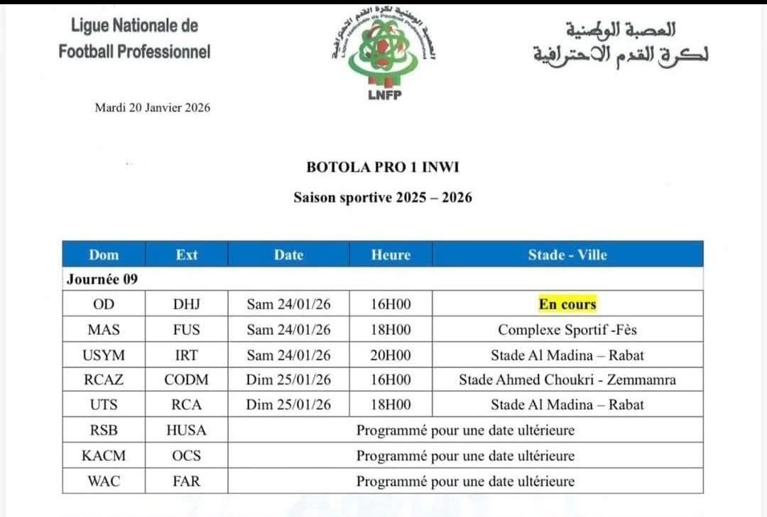 بعد إسدال الستار على نهائيات كأس افريقيا للأمم 2025 تعود عجلة البطولة الوطنية الإحترافية الى الدوران من جديد ابتداء من يوم السبت 24 يناير الجاري عبر برمجة ثلاثة مباريات، وذلك في إطار إستئناف المنافسات التي توقفت مايقارب شهرين ونصف،