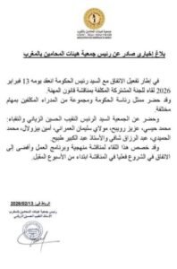 أصدر رئيس جمعية هيئات المحامين بالمغرب بلاغا إخباريا كشف فيه عن عقد لقاء مشترك، يوم أمس الجمعة 13 فبراير الجاري، في إطار تفعيل الاتفاق المبرم مع رئاسة الحكومة بشأن مناقشة مشروع قانون مهنة المحاماة، وذلك في خطوة جديدة تروم تعزيز التشاور المؤسساتي حول هذا الورش المهني الهام .