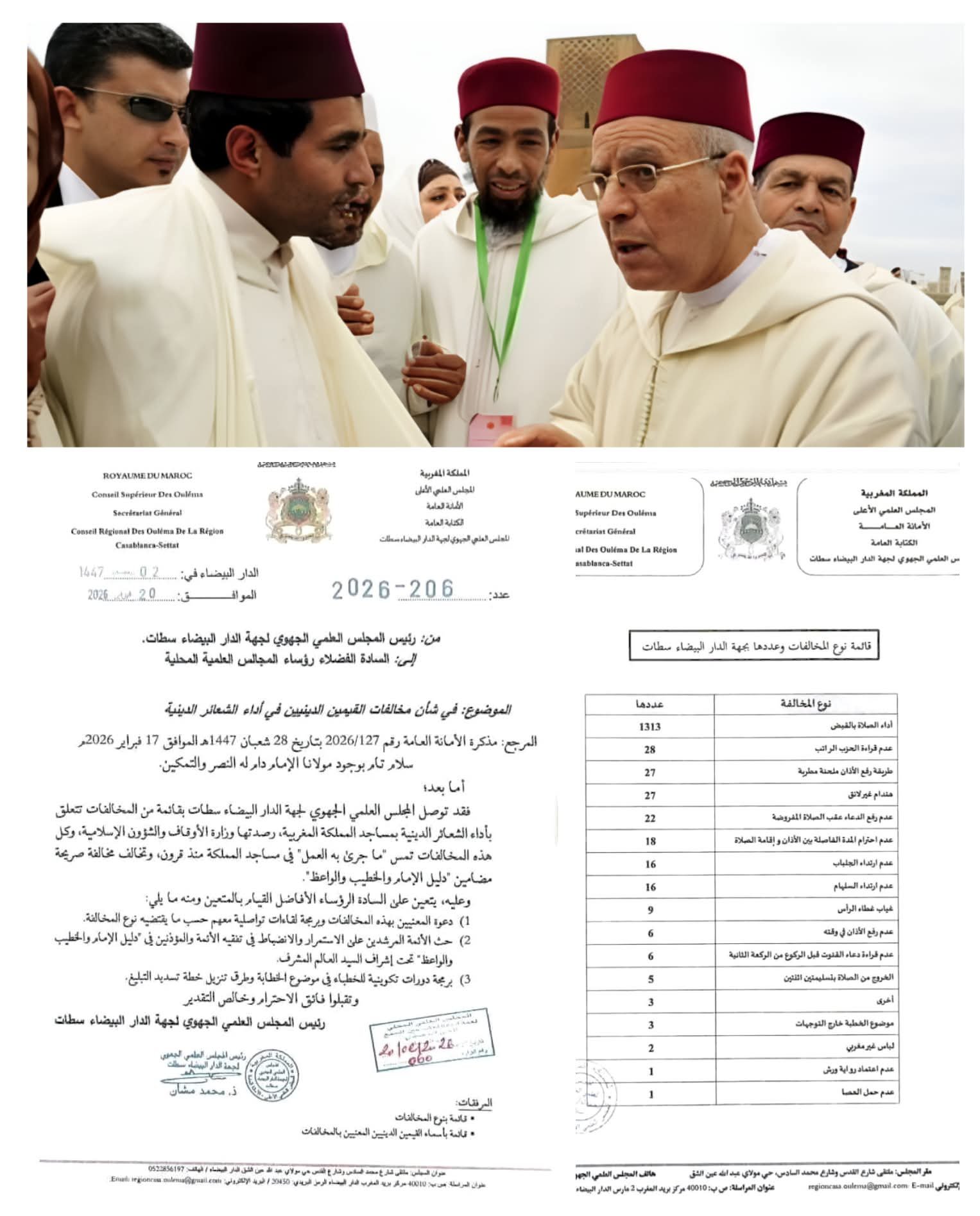 كما شملت اللائحة مخالفات أخرى تعلقت بعدم رفع الدعاء عقب الصلوات المفروضة، وعدم احترام المدة الفاصلة بين الأذان والإقامة، وغياب ارتداء اللباس التقليدي المغربي كالجلباب والسلهام وغطاء الرأس، وصولاً إلى تسجيل حالات تتعلق بعدم اعتماد رواية ورش أو عدم حمل العصا أثناء الخطبة.