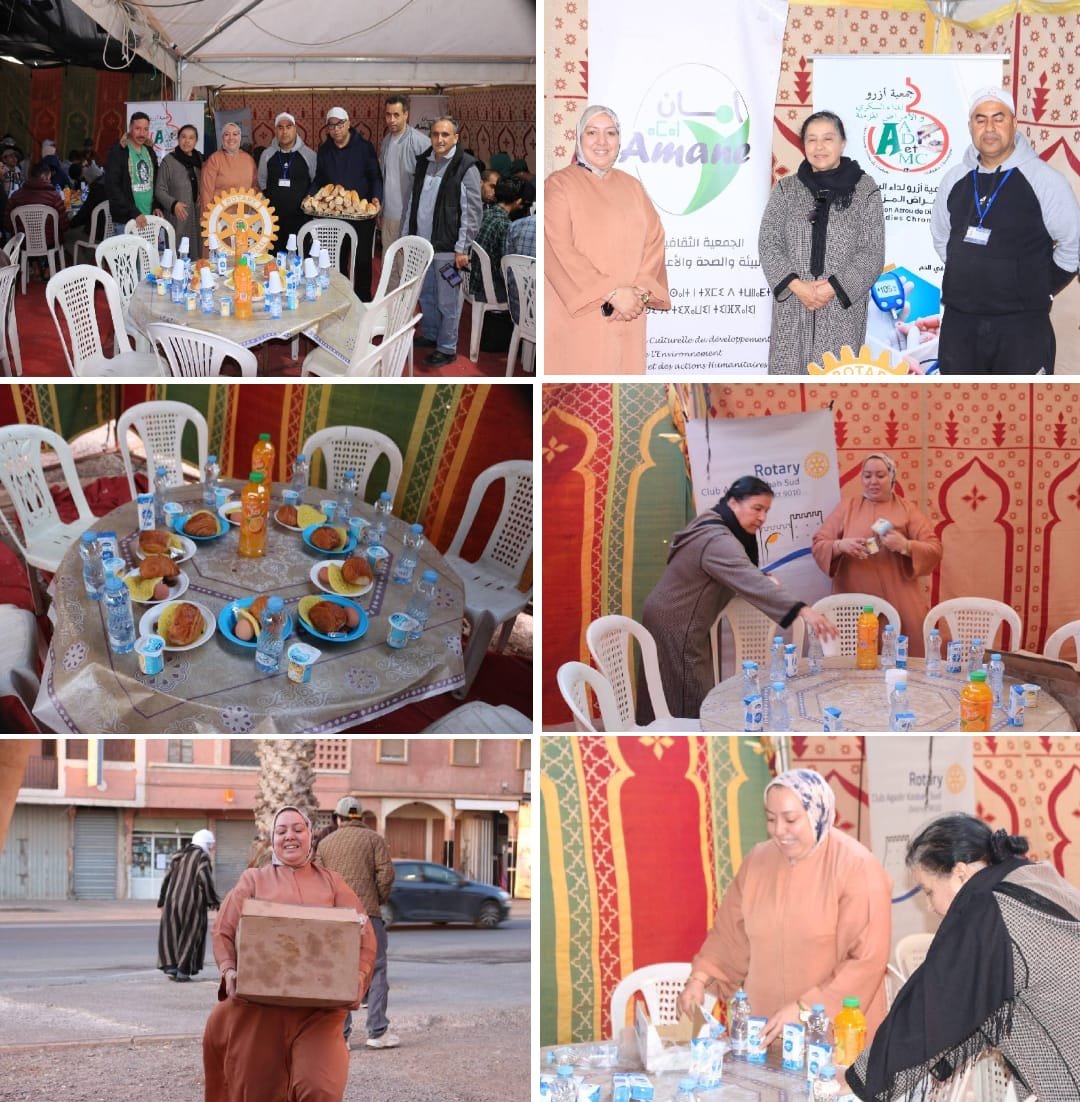 في أجواء رمضانية مفعمة بالدفء الإنساني وروح التضامن والتآخي، نظمت جمعية أزرو لداء السكري والأمراض المزمنة، بشراكة مع جمعية أمان للثقافة والتنمية وبتنسيق مع نادي روتاري قصبة الجنوب أكادير، إفطارًا رمضانيًا جماعيا لفائدة الطلبة وعابري السبيل، استفاد منه حوالي 160 شخصا .