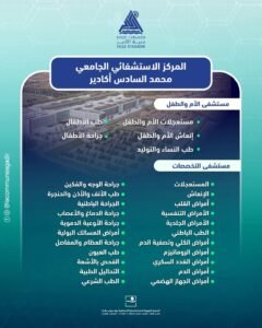 من جهته، يضطلع المركز الاستشفائي الجامعي محمد السادس بأكادير بدور محوري في هذه المرحلة، حيث استقبل حزمة واسعة من الخدمات الطبية، فقد تم تعزيز “مصحة النهار” لتقديم علاجات متعددة تشمل الأمراض التنفسية ومرض السل، أمراض القلب، الأمراض الجلدية، الطب الباطني، أمراض الروماتيزم والجهاز الهضمي، إضافة إلى طب الأطفال وطب العيون .