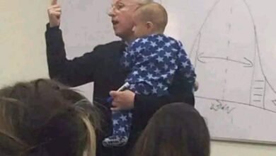 أستاذ جامعي يحمل طفلا صغيرا أثناء إلقائه المحاضرة