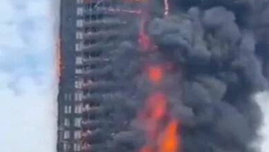 عاجل حريق مهول شب بناطحة سحاب بالصين