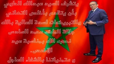 يتشرف السيد عبدالله الحلوي بمناسبة عيد الأضحى المبارك بأن يتقدم بأحر التهاني والتبريكات لسدة العالية بالله جلالة الملك محمد السادس…