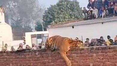 صور مثيرة للجدل لنمر ضخم يرقد بسلام على جدار سكان قرية هندية