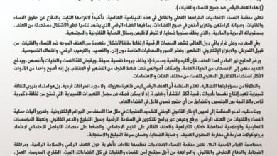 منظمة النساء الاتحاديات تصدر بيانا بمناسبة الحملة الدولية لمناهضة العنف ضد النساء